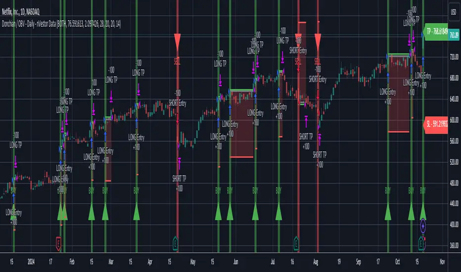 This trading strategy combines the Donchian indicator with On Balance Volume (OBV) and a long Simple Moving Average (SMA) to generate entry signals for both long and short positions. To find trade exits this strategy uses a multiplier of the Average True Range (ATR) to find take profit and stop loss levels at the start of the trade. To get access this strategy please send me a message.
