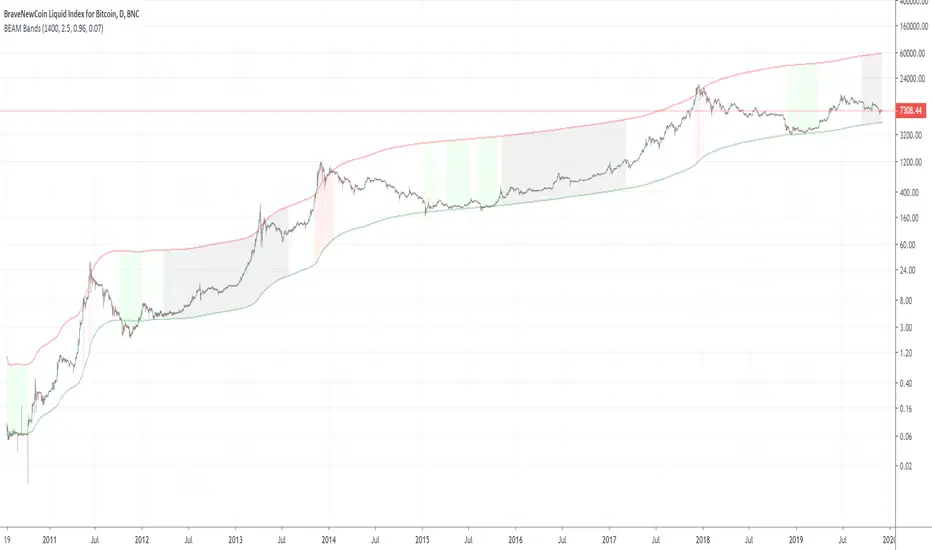 BEAM Bands is a version of the BEAM indicator that is drawn directly on the price chart. It is a more visual representation of BEAM and lets you compare it directly to the price.