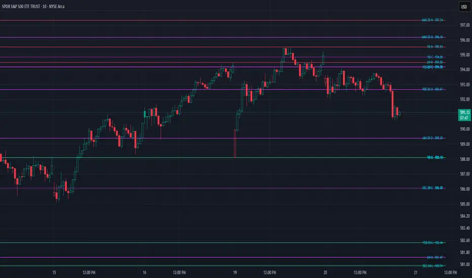 Everything’s fully customizable. You pick which timeframes to show, which price types (O/H/L/C) matter, and where the labels appear. Highs are red, lows are lime. Monthly opens are fuchsia, closes are purple — easy to separate at a glance.
