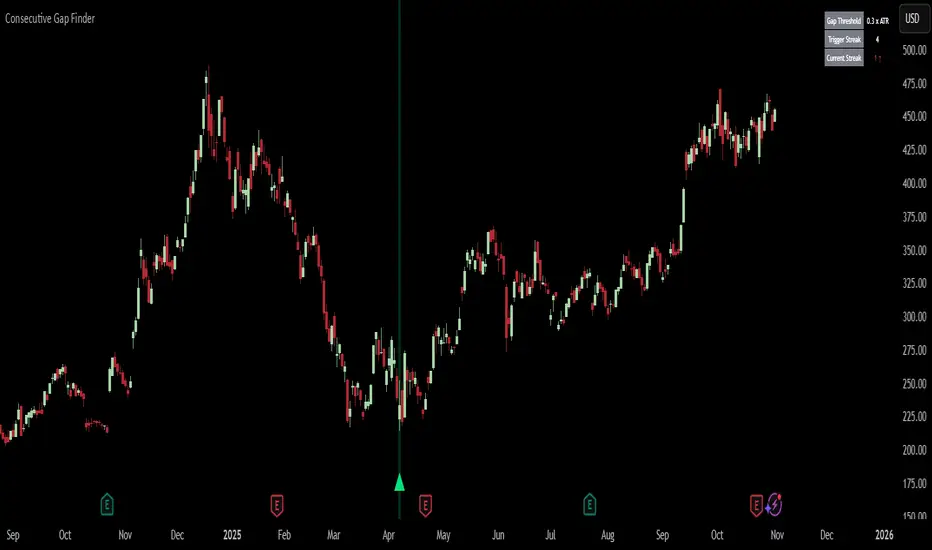 Looks for consecutive gaps based on daily chart using ATR multiplier.