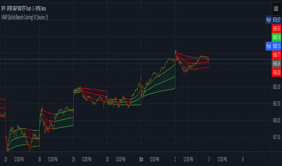 VWAP (Bullish/Bearish Coloring) is a Pine Script v6 indicator for TradingView that plots a Volume-Weighted Average Price (VWAP) with customizable anchor periods and optional upper/lower bands. It can apply peak/trough-based coloring to reflect recent swing direction. Optional resets tied to corporate actions help maintain continuity over longer periods. It is commonly used to review dynamic support/resistance behavior across timeframes.