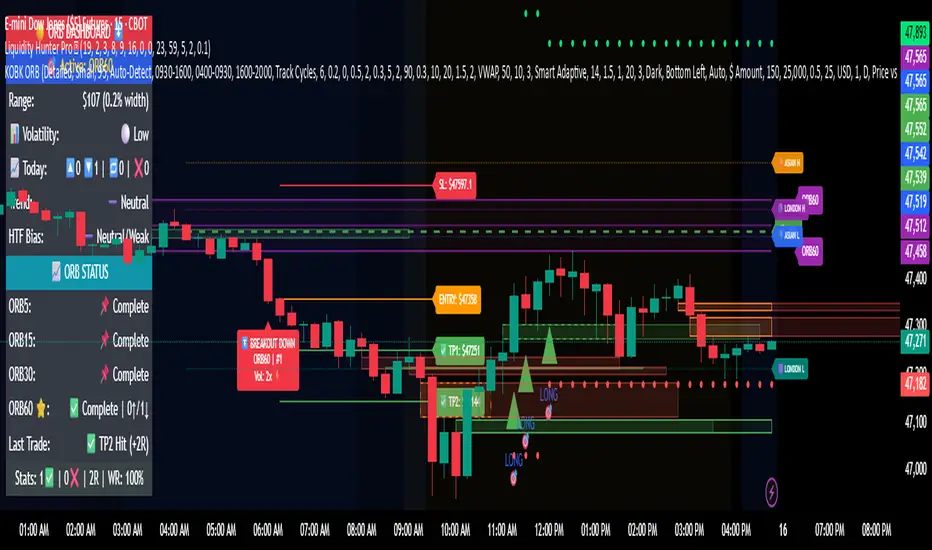 KOBK ORB is a professional-grade **Opening Range Breakout (ORB)** indicator designed for intraday traders. It automatically detects and tracks opening ranges during the first 5, 15, 30, and 60 minutes of the trading session, then signals when price breaks out of these ranges with advanced filtering.