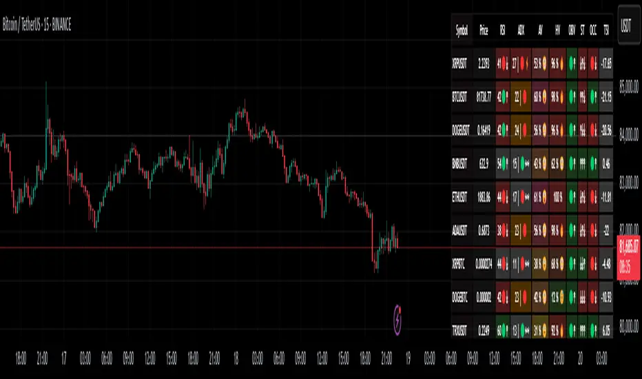This exclusive TradingView screener provides real-time monitoring of 20+ user-selectable instruments in a structured table format. Designed for traders who rely on technical indicators, this script offers dynamic alerts and background color-coded trends for quick decision-making.