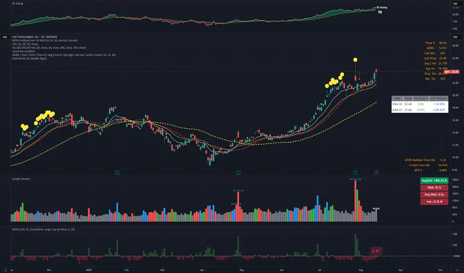This indicator provides real-time analysis of price distance from key Exponential Moving Averages (EMA 10 and EMA 21) on the daily timeframe, regardless of your current chart timeframe. It displays both percentage and volatility-adjusted (ATR) distances in a clean, customizable table format.
