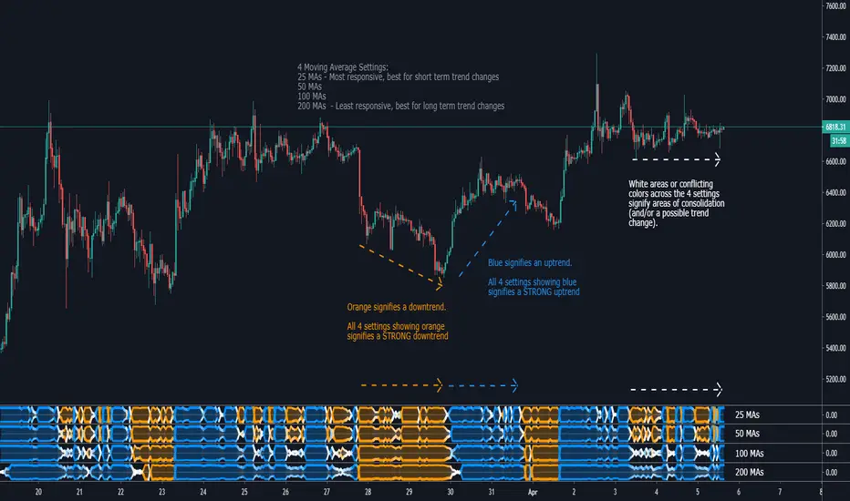 White areas signify some MAs are above while others are below price action, indicating periods of consolidation or trend change.