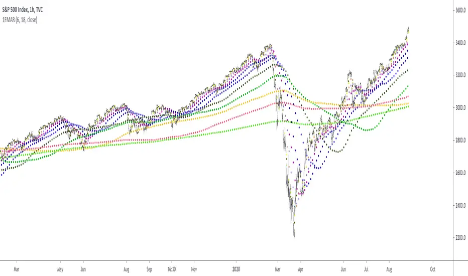The following script aims to visually reproduce a Fibonacci moving averages ribbon by only using one plot function, the period of the moving average is determined by a number of the Fibonacci sequence. This trick is made possible by computing the value of a moving average at time t with a period determined by a periodic Fibonacci sequence and using plot.style_circles as plot style.