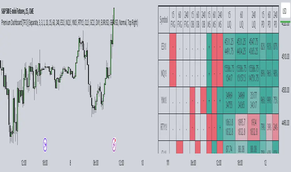 - The Dashboard will now display when price last encountered a given POI, using the POI's timeframe as a reference. For example, if the table cell for NQ1! 1D FVG says "H (3)", the "H" implies that NQ1! made a 1D high in or beyond a bearish 1D FVG, and traded away from it without mitigating it; and the "(3)" implies that this occurred 3 bars ago, on the 1D timeframe
