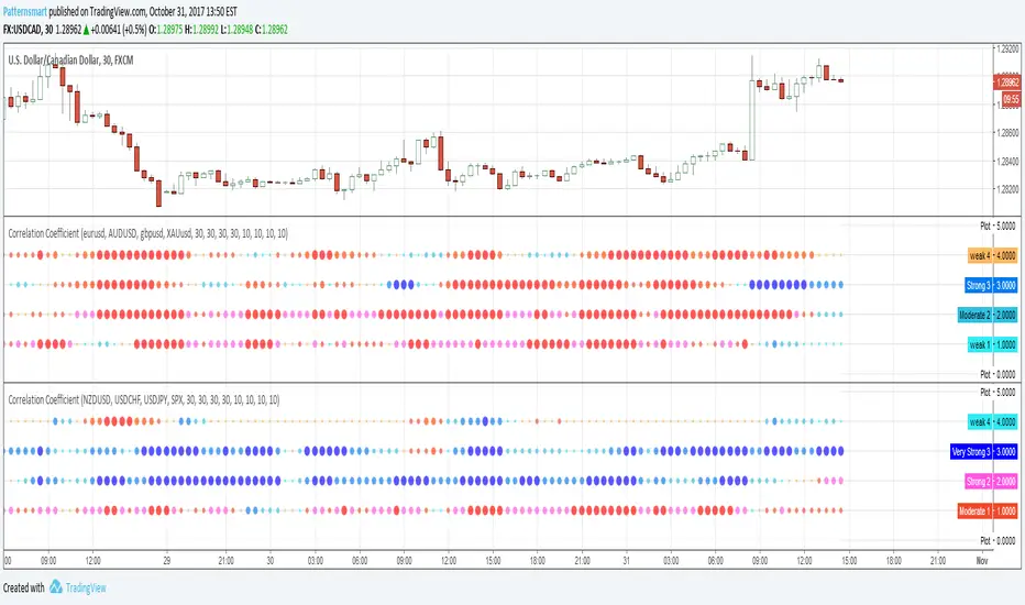 Each dot shows the correlation coefficient between the two symbols over the corresponding timeframe and period inputs. The following categories indicate a quick way of interpreting the table values. Note that a negative correlation means the two currency pairs correlate in the opposite directions (e.g. when the price for one goes up, the other one goes down and vice versa)