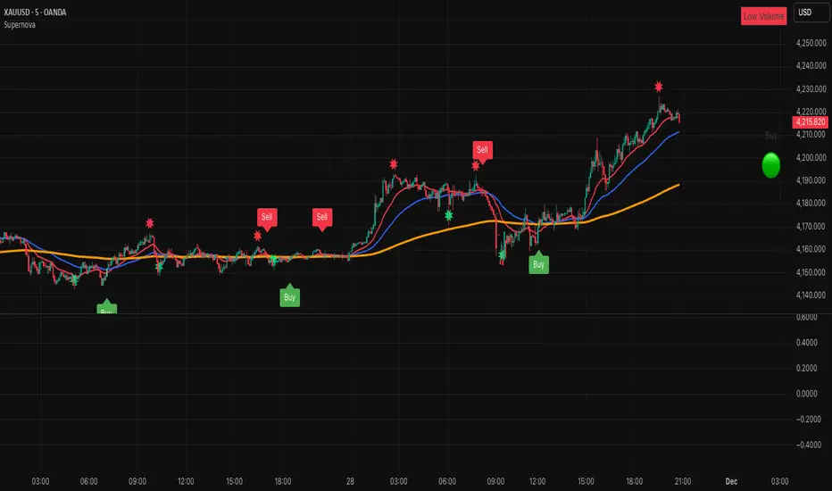 Supernova is a trend-following indicator designed to identify potential entry and exit points. It displays key levels including point of interest, invalidation, and multiple take profit targets