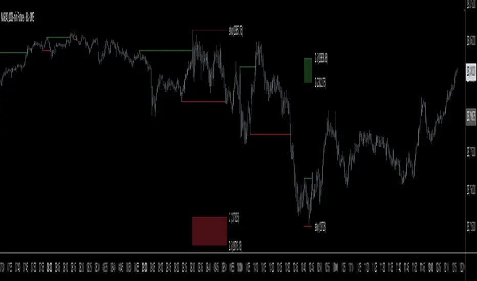 The third component is a structure shift detection mechanism. This mechanism is based on relative pivot strength of recent price action. New legs in price action form by breaking above or below the pivots based on recent price action. By default, the pivots are based on the current timeframe but can be adjusted to watch for price breaks above any timeframe larger than the current chart.