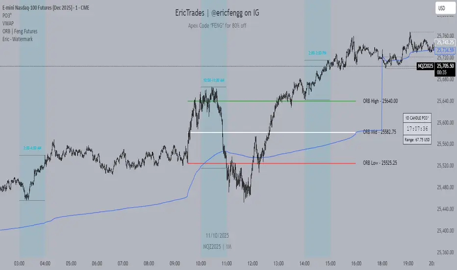 The ORB | Feng Futures indicator automatically detects the Opening Range Breakout (ORB) for each trading session, plotting the High, Low, and Midline in real time. This tool is built for futures traders who rely on ORB structure to confirm trends, identify breakout zones, and recognize reversal areas early in the session.