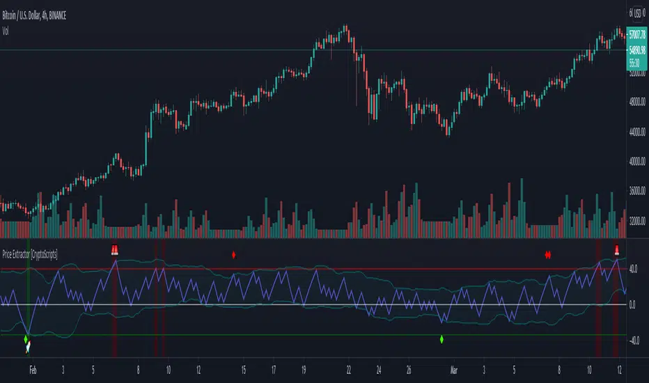 This indicator is a strong indicator by itself but works best when paired with my Volume Extractor indicator i.e taking a trade when both indicators are displaying overbought/oversold or crossing outside of the bollinger bands. Measuring price action is an extremely important aspect of trading and one I believe should not be overlooked. I hope I made everything as clear as possible and please let me know if I didn't.