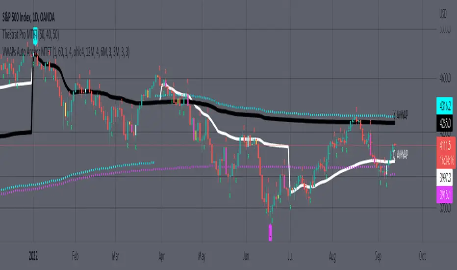 1. Three user selected time frames auto anchored VWAPS. It will auto anchor to the start of the timeframe. Timeframes(TF) include: Yearly(Y), Semi-annually(S), Quarterly(Q), Monthly(M), Weekly(W), Daily(D), and 4 hour. Image below shows the D candlestick as the active timeframe, the anchored VWAPs for the Year, Quarter, and Month.