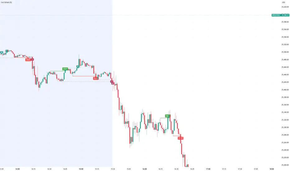 Visualizes Change of Character (CHoCH) and Break of Structure (BoS) - two fundamental Smart Money Concepts for identifying trend reversals and continuations.