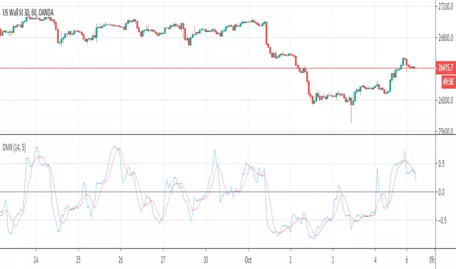 Indicator DMX (Bipolar DMI) is calculated using the standard indicator ADX. However, as compared to that, it displays data as an oscillator with a signal line, and has shorter delay.
