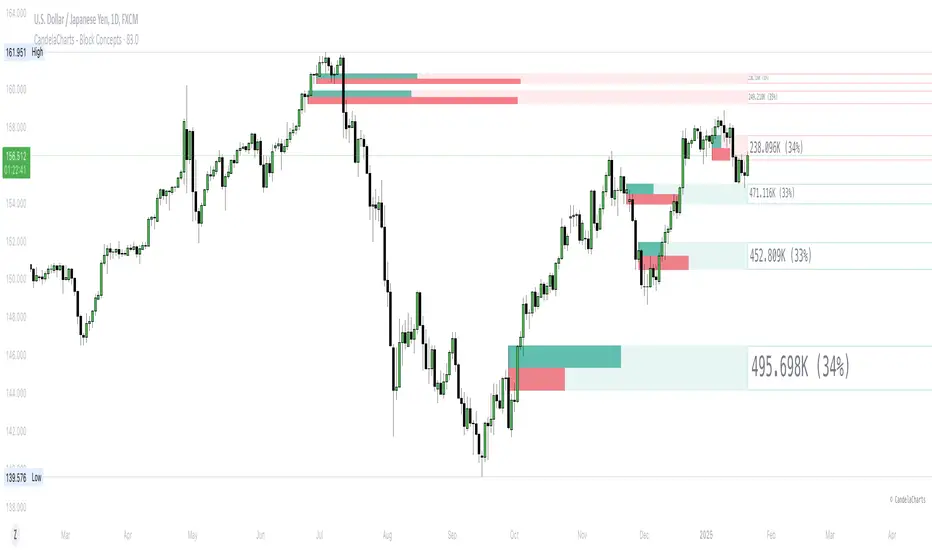 Block Concepts is a powerful toolkit inspired by ICT principles, designed to identify and highlight key areas of potential support and resistance. It includes the following block types:
