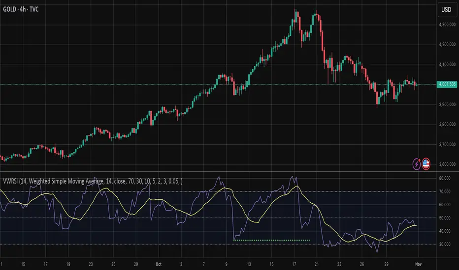 Volume-Weighted Calculation: An option (Volume weighted) allows for volume to be incorporated into the calculation of both the RSI itself and its moving average signal line, making the oscillator more sensitive to high-volume price changes.