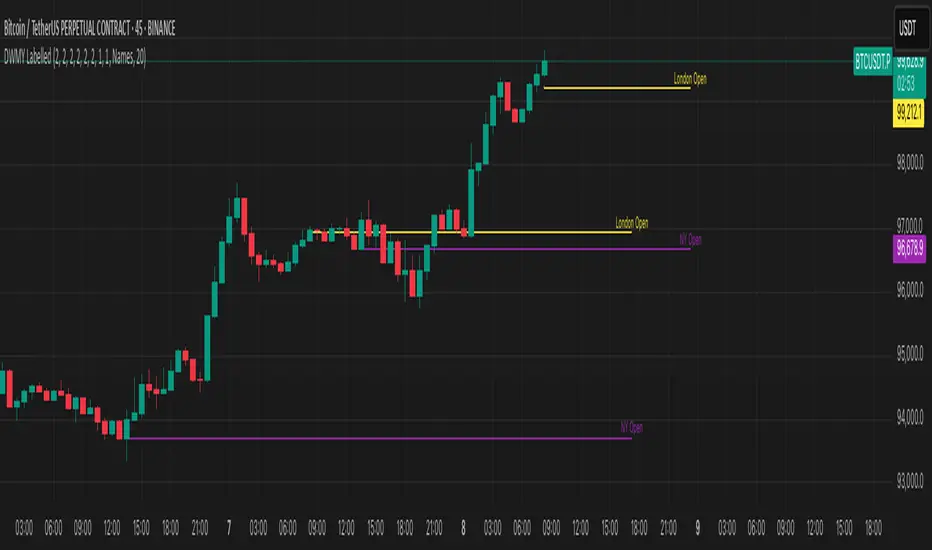 • Daily Opens: Plots the opening prices of daily candles. The color, visibility, and lookback period are customizable.