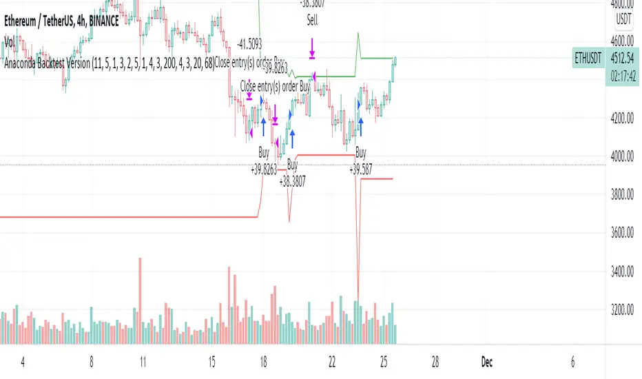 Anaconda waits for some thresholds to enter long. Once it enters long, it will setup profit and stoploss targets. These targets are updated if some conditions are met. The position is closed when the price hits profit or stoploss targets or when a certain bearish threshold is met.