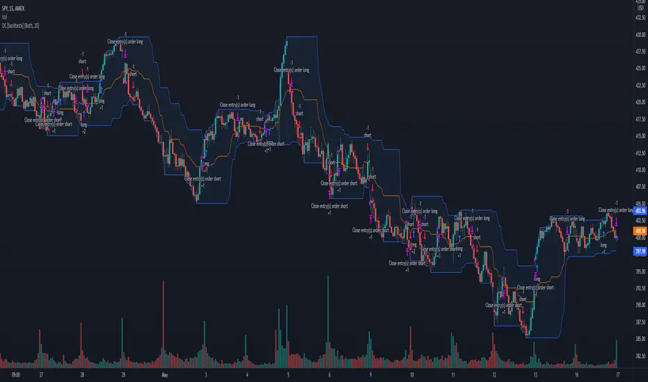 This strategy enters long when the Donchian channel's upper line creates a new high, and exits when price goes below the middle line.