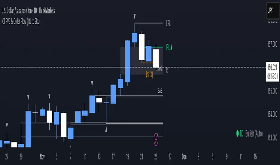 Markets move where liquidity is. According to iCT theory, price usually sweeps internal liquidity (IRL) first and then hunts for external liquidity (ERL). By mapping this process in real time, the indicator provides a clear framework for understanding market structure, liquidity grabs, and directional bias.