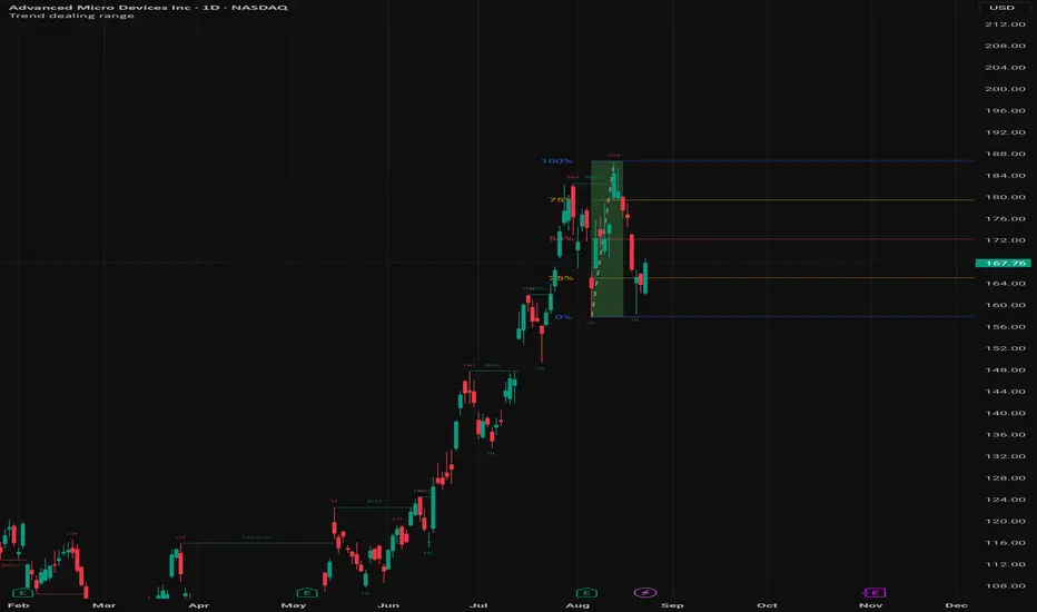 This indicator will help you find the current dealing range according to the trend. If the trend is bullish the indicator will look for a range between the latest low pivot to the latest high pivot. Vice versa in a bearish trend. The code uses my new library 'FibonacciRetracement' (tradingview.com/script/lm5l7XJl-FibonacciRetracement/) that has the same code as my other indicator 'Fibonacci retracement' (tradingview.com/script/yFIioDwi-Fibonacci-retracement/).