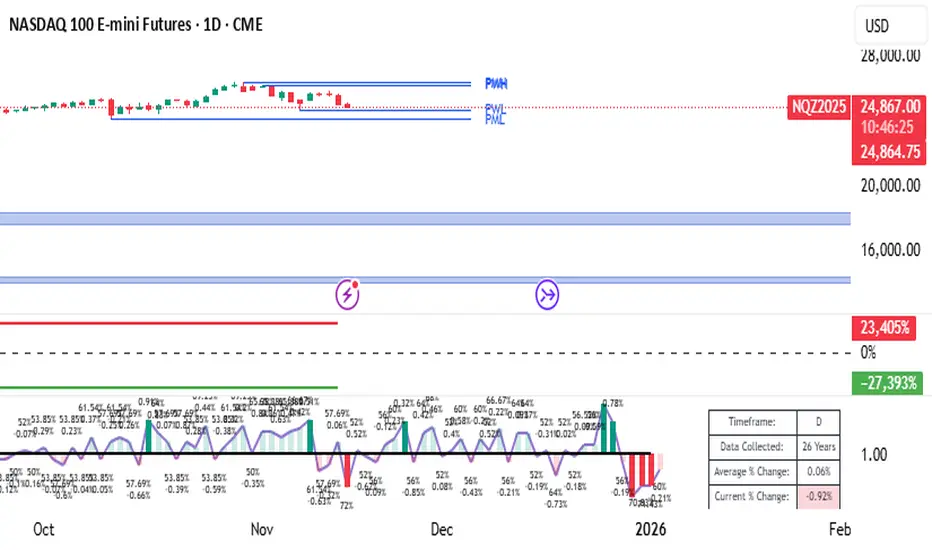 The "Seasonality PH (Full History)" indicator provides an in-depth analysis of the seasonal tendencies of a selected symbol by utilizing all available historical data. The indicator aggregates historical movements (Long/Short) and calculates the Expected Value (EV) for each period (Daily, Weekly, Monthly, Quarterly), offering a more robust view of the actual average gain/loss. The visualization is based on the Long/Short bar ratio (Bias) within the given period, where the column's height reflects the strength of the prevailing direction, and the direction (up/down) indicates the Long/Short bias. The indicator also includes a table with key statistics, including a prediction for the next 3 periods.