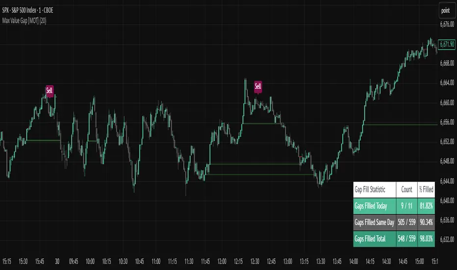 Max Value Gap [MOT] is a real-time gap fill detection system that visualizes institutional-style intraday price inefficiencies on major indices like SPX and NDX. Built for scalpers and short-term traders, it helps identify prime reversal areas where price is likely to return — often within the same session.