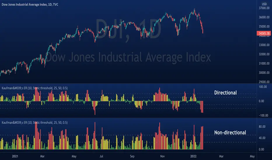 - Can be used to filter out choppy entry signals produced by existing trade strategies. If trying to enter during periods of consolidation, then ER should ideally be low. On the other hand, for mean reversion strategies, ER should be expected high.