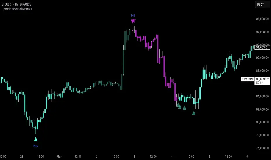 The Uptrick: Reversal Matrix + is designed as a comprehensive tool that organizes market information in a visually intuitive way. It presents a variety of signals and data points on the chart, aiming to provide clarity about potential reversals, directional momentum, and the broader context surrounding price behavior. By consolidating numerous indicators and statistics into a single interface, it serves as a versatile companion for different trading styles and time horizons.