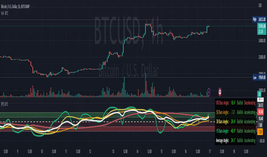 This indicator provides Linear Regression (LR) Angle in degree that may be more easily interpreted by some traders as we are more accustomed to line angles in degree and know how to visualize them.