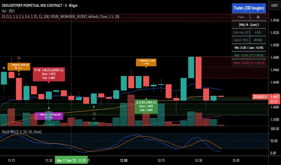 **51 ALGO** is an advanced trading indicator that combines **4 technical analysis methods** (Stochastic RSI, Price Zone, EMA, Heikin Ashi) to generate **precise buy/sell signals** with **automatic risk management**.