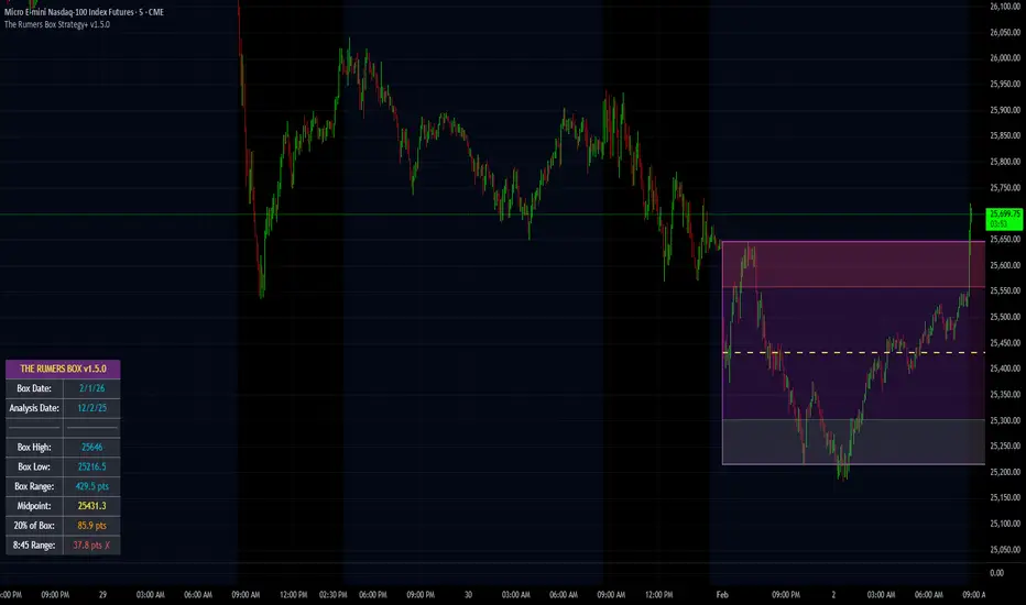 This indicator implements Doug Rumers' Box Strategy methodology for identifying high-probability trading setups based on historical price ranges and opening candle analysis.
