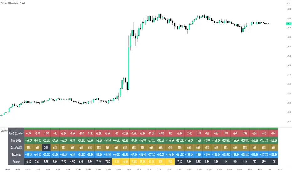 Improved Delta/Volume % Row: This metric is now highly informative, showing varying percentages based on candle strength:
