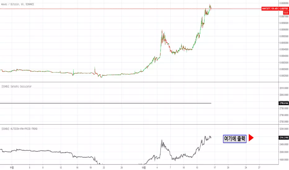 본 지표는 BTC마켓에 있는 알트코인의 원화가격을 원화차트를 확인하지 않아도 실시간으로 알려주는 보조지표 입니다.
