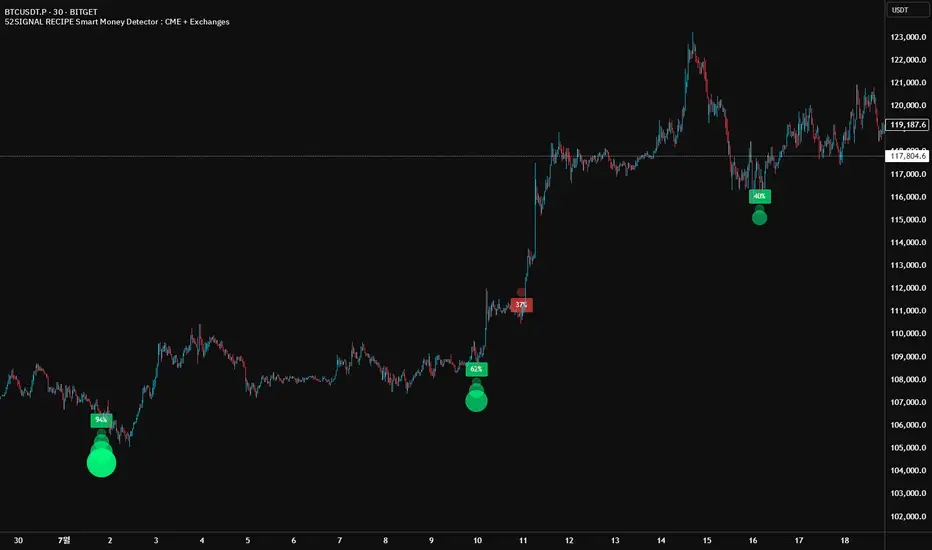 52SIGNAL RECIPE CME-Exchange Smart Money Detector는 규제된 선물 시장과 암호화폐 거래소 시장 모두에서 기관의 포지셔닝을 드러냄으로써 트레이더에게 강력한 우위를 제공합니다. 두 거래소에서 동기화된 신호를 요구함으로써, 시장 노이즈를 제거하고 가장 신뢰할 수 있는 스마트 머니 흔적을 식별합니다.