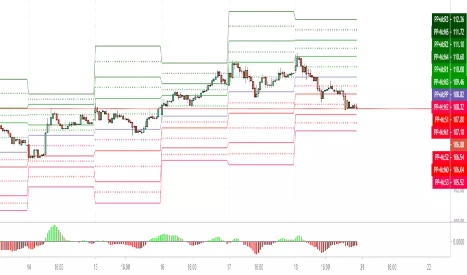 Данный индикатор рассчитывает не только основные уровни Pivot Point (Floor), но и так называемые средние, медианы.