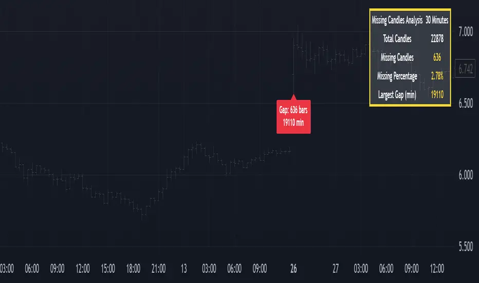 Overview The Missing Candle Analyzer is a Pine Script tool developed to detect and analyze gaps in candlestick data, specifically for cryptocurrency trading. In cryptocurrency markets, it is not uncommon to observe missing candles—time periods where no price data is recorded. These gaps can occur due to low liquidity, exchange downtime, or data feed issues.