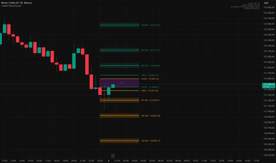 Custom Fibo Line v.jd is a custom Fibonacci indicator designed to display two symmetrical Fibonacci sets (upward and downward) based on a single anchor candle chosen by the user.