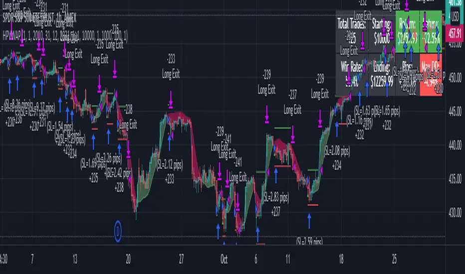 We use the Hodrick-Prescott filter applied to the closing price, and then take the outputted trendline and apply a custom vwap, the time frame of which is based on user input, not the default 1 day vwap . Then we go long if the value 2 bars ago is greater then one bar ago. We sell and color the bars and lines when the if the value of 2 bars ago is less than one bar ago.