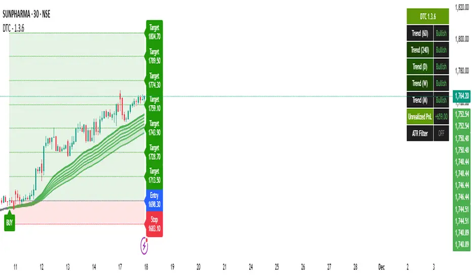 DTC 1.3.6 is a professional-grade, multi-layer trading system that integrates EMA-based trend detection, volatility filtering, dashboard visualization, and algo automation into one cohesive tool.