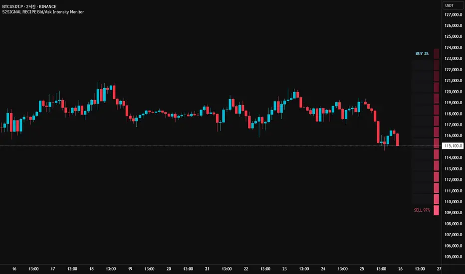 52SIGNAL RECIPE Bid/Ask Intensity Monitor는 실시간으로 시장의 매수/매도 세력 균형을 시각화하는 기술적 지표입니다. 이 지표는 캔들 구조를 기반으로 매수와 매도 압력의 상대적 강도를 계산하고, 직관적인 그라데이션 색상 게이지를 통해 표시함으로써 시장 참여자들의 단기 심리와 거래 활동을 한눈에 파악할 수 있게 합니다.