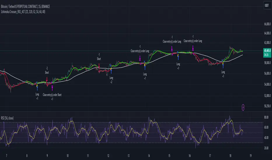 The "Ichimoku Cloud Crosses_AIT" strategy is a technical trading strategy that combines the Ichimoku Cloud components with the Relative Strength Index (RSI) to generate trade signals. This strategy leverages the crossovers of the Tenkan-sen and Kijun-sen lines of the Ichimoku Cloud, along with RSI levels, to identify potential entry and exit points for long and short trades. This guide explains the strategy components, conditions, and how to use it effectively in your trading.