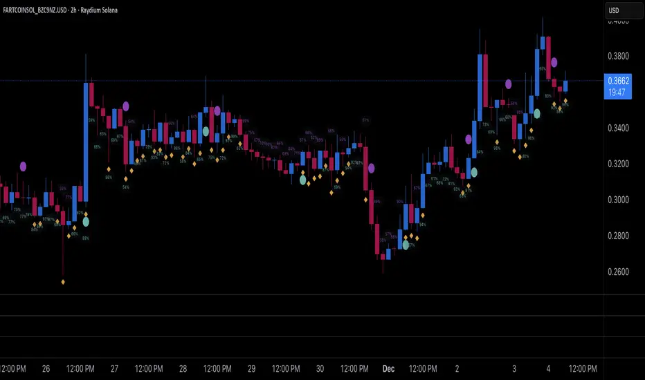 Visual Markers: Optional fight diamonds highlight candles intersecting the reference price, while dynamic labels show the exact strength percentages.