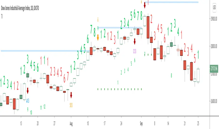"There is an issue pertaining to queued and deferred counts for Sequential, Aggressive and Combo completing out of order which will result in the wrong Countdown number being registered. If the current printed Countdown number, and the successive (nonprinted) queued Countdown are being deferred, and a third-level or higher (nonprinted) queued Countdown completes to a 13 count prior to the completion of the other preceding counts, the script will not register this queued 13 count on the chart, nor will its history be properly recorded. When the prior counts have completed, the completed count will begin from Countdown number 1, not taking into account the candle history since its respective Setup 9 was reached. This issue is most likely to occur on the Combo, where steep price movement followed by a pullback can lead to Combo counts being deferred for long periods without setting a "close lower/higher than the prior Countdown close". This issue is also present, although to less likely, in long deferred Sequential 13 Countdowns, and only applicable to Aggressive counts when the deferred checkbox is enabled in the settings. This Situation is incredibly rare and very unlikely to occur"