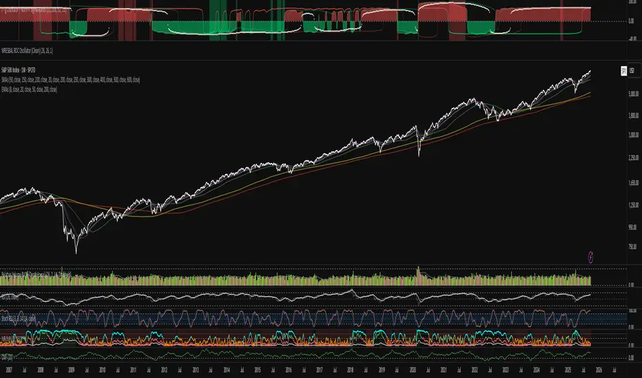 Track shifts in the macro tide rather than short-term waves. Sustained green phases typically align with bull-market environments; red phases often coincide with tightening cycles or recessions. Combine with faster liquidity or breadth measures (e.g., WRESBAL ROC) for tactical confirmation.