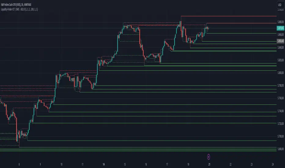 - The Indicator show open liquidity as solid lines and liquidates liquidity as dashed lines