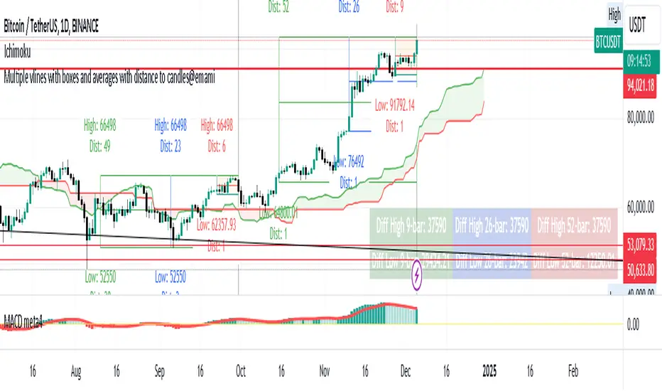 This Pine Script is designed to help traders analyze price movements over different time frames by visually drawing vertical lines and boxes based on selected date/time points. The script calculates the highest high, lowest low, and midpoints of the last 9, 26, and 52 bars, drawing a box around each range. Additionally, the script displays the distance from the high and low to the current bar.