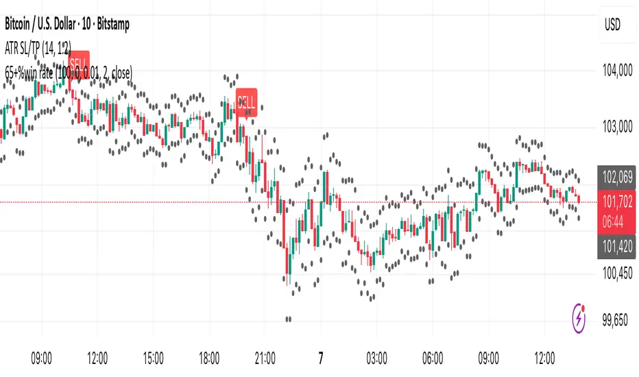 ATR SL/TP Precision Zones (Dots) is a volatility-based tool designed to help traders set accurate Stop Loss and Take Profit levels based on real market volatility — not fixed pips or emotion.This indicator uses ATR (Average True Range) multiplied by 1.2 to calculate dynamic distance bands.