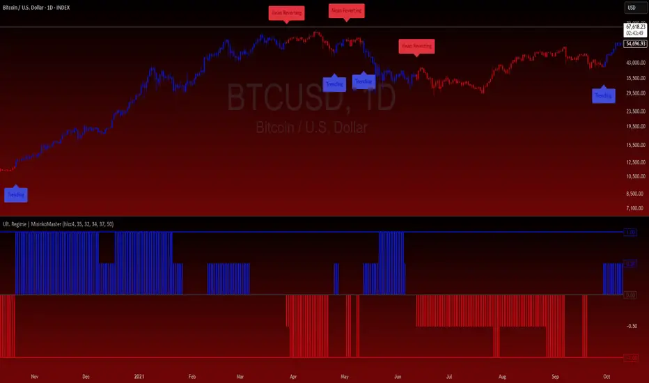 Ultimate Regime is an advanced market environment classification tool designed to identify whether an asset is currently operating in a trending or mean-reverting regime. Instead of focusing on entry signals, the indicator concentrates on answering a more fundamental question: what type of market are we trading right now?